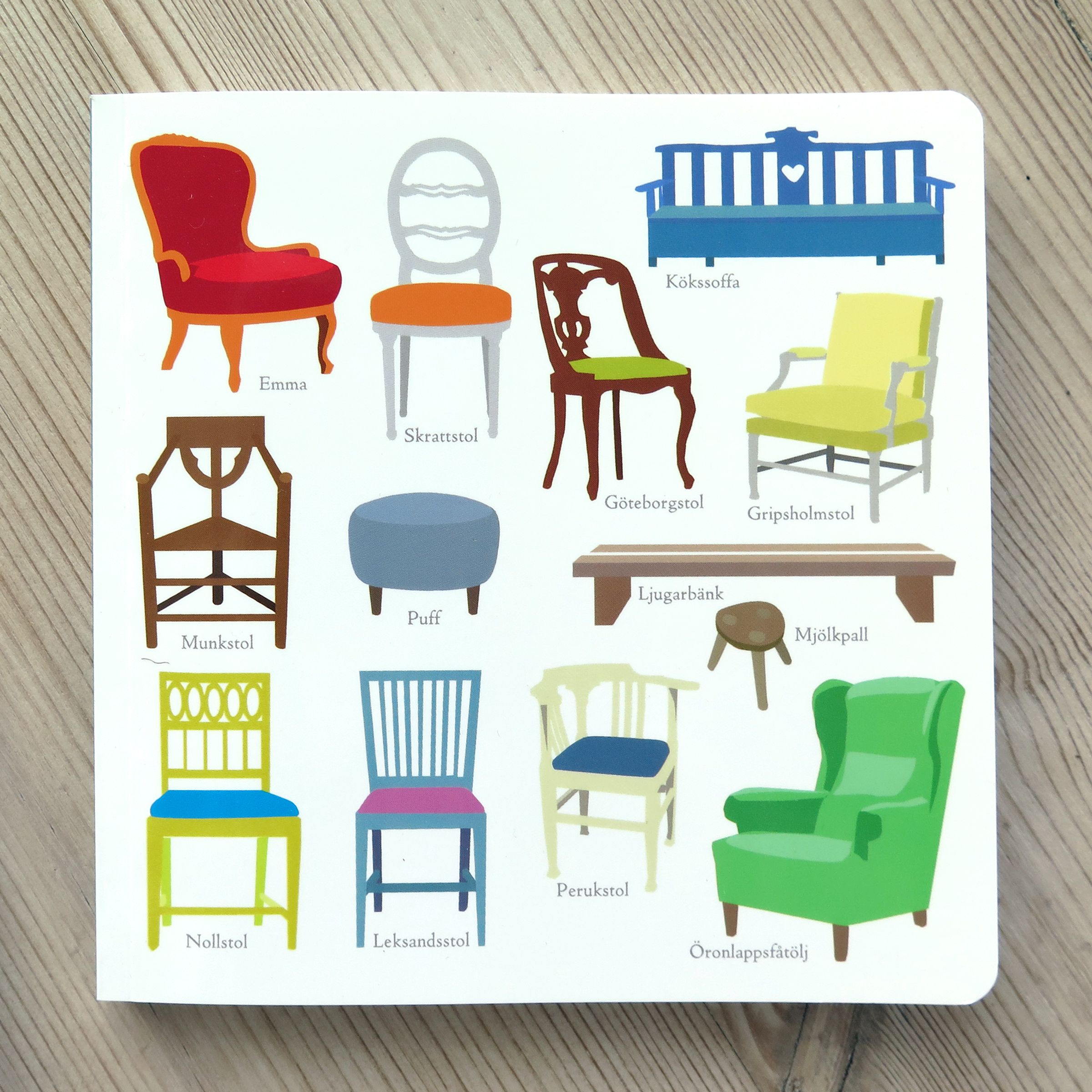Swedish sitting furniture: Emma  •  skrattstol (laugh chair)  •  Göteborgsstol (Gothenburg chair)  •  kökssoffa (kitchen couch)  •  Gripsholmsfåtölj (Gripsholm armchair)  •  munkstol (monks chair)  •  puff (pouf)  •  ljugarbänk (liers bench)  •  Leksandsstol (Leksand chair)  •  nollstol (zero chair)  •  perukstol (wig chair)  •  mjölkpall (milking stool)  •  and down in the right corner – the “öronlappsfåtölj” (“ear-flap-armchair”).