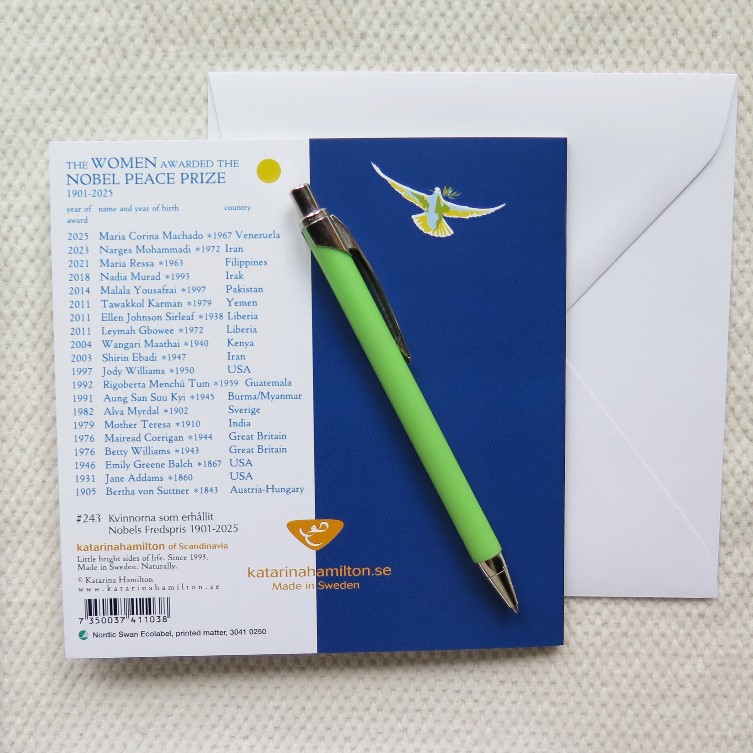 HemNyinkommet kort m kuvert: “Kvinnorna som erhållit NOBELS FREDSPRIS 1901-2025”